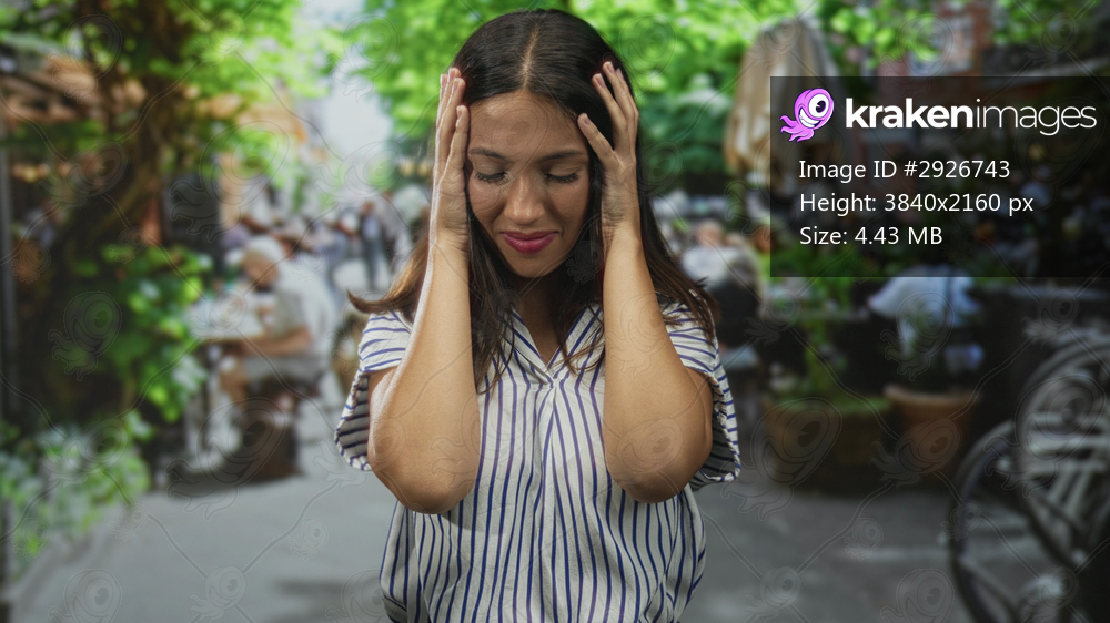 Woman holding hands to temples on street terrace restaurant with potted plants and diners blurred behind; stress recovery.