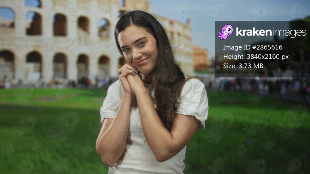 Woman holding hands together in front of chest at roman coliseum outdoors under sunlight; excitement.