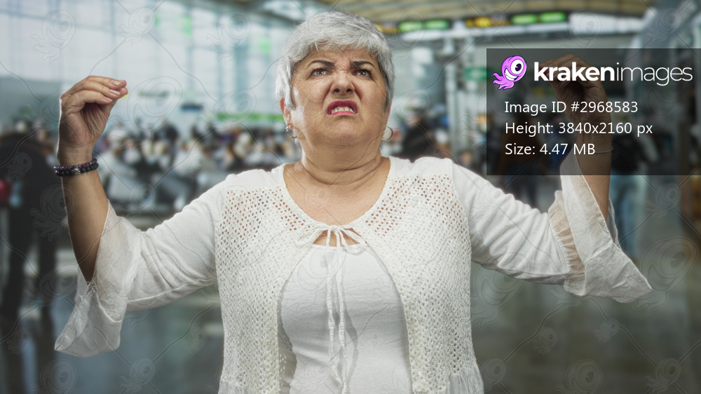 Woman holding hands up and grimacing, palm and wrist visible, reacting to crowd in busy airport terminal; travel frustration.