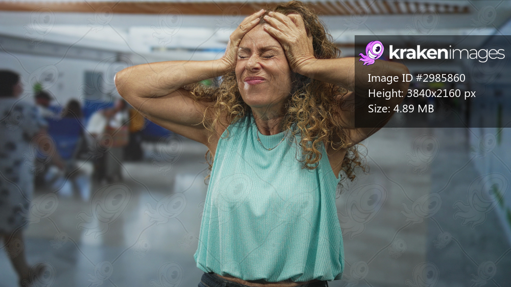 Woman holding head with both hands and grimacing, clutching temples in busy airport terminal; travel stress delay.