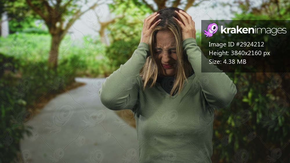 Woman holding head with both hands on a forest path, face scrunched and eyes closed showing pain for headache; anxiety.