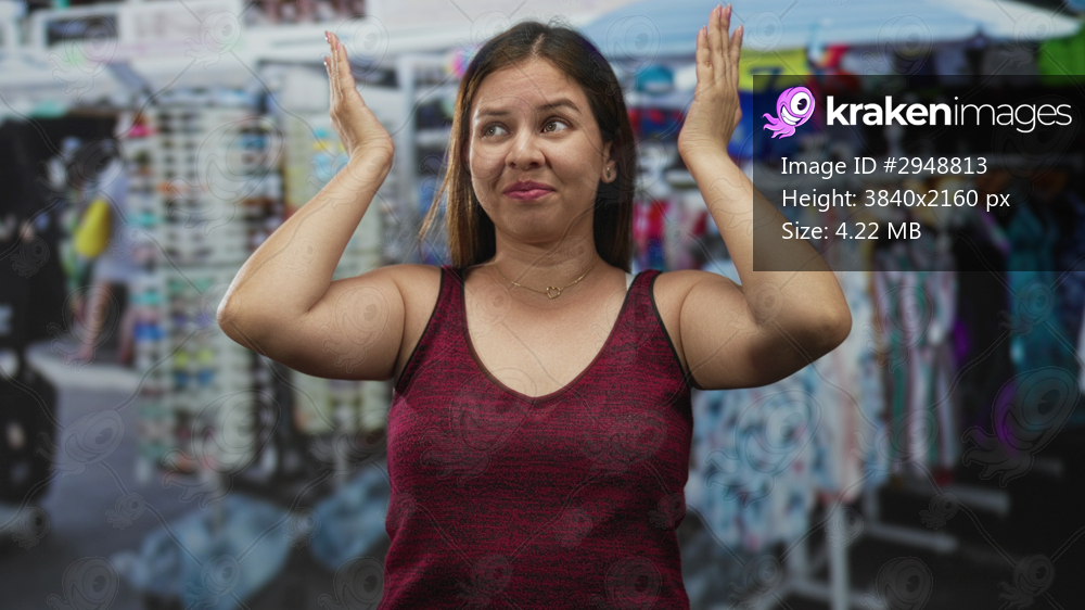 Woman holding head with hands at a busy street market stall with racks of garments and a canopy while wearing a tanktop and necklace; shopping frustration. - Kraken Images