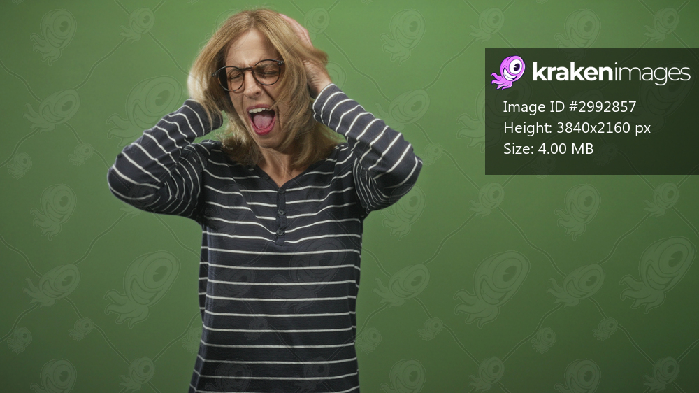 Woman holding head with hands, glasses and striped shirt visible, mouth open eyes closed, screaming in studio; frustration release.