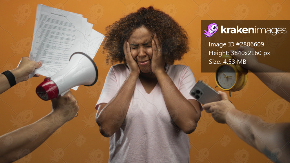 Woman holding head with hands while surrounded by megaphone, papers, alarm clock and smartphone in orange studio; stress time pressure.