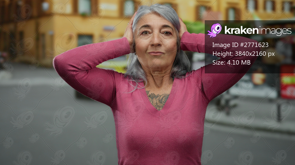 Woman holding head outdoors with grey hair, wearing pink sweater on street with thoughtful expression, suggesting urban stress or contemplation in a city setting. - Kraken Images