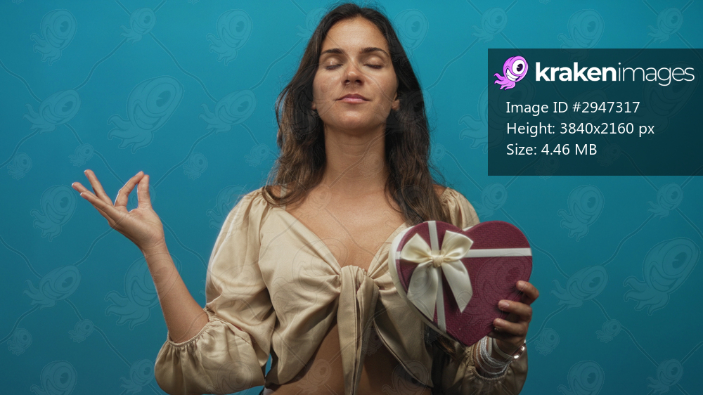 Woman holding heart gift box and hand in meditation mudra showing cleavage in studio with teal blue backdrop; serenity.
