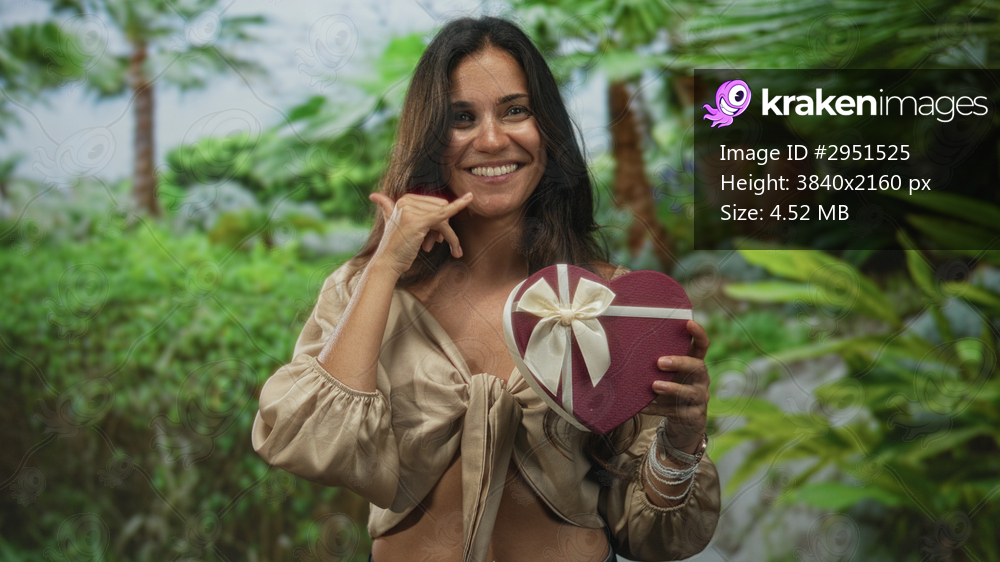 Woman holding heart gift box and making call me hand gesture in forest park surrounded by green foliage, smiling and showing ribboned box; playful romance. - Kraken Images
