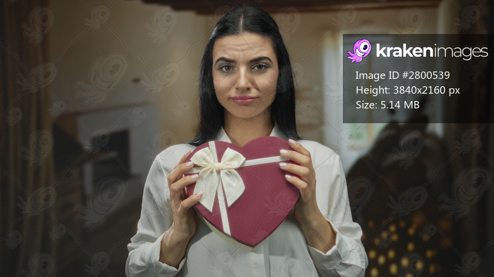 Woman holding heart-shaped gift box indoors looks thoughtful in cozy living room with soft natural light.