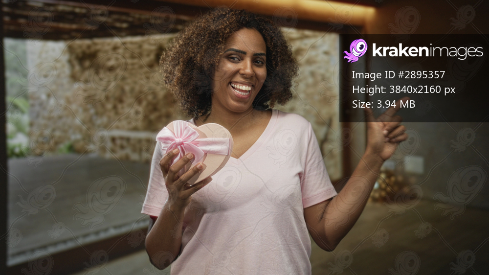 Woman holding heart shaped gift box with left hand while pointing finger to side in studio empty room with warm lighting and smiling expression; gift giving joy. - Kraken Images