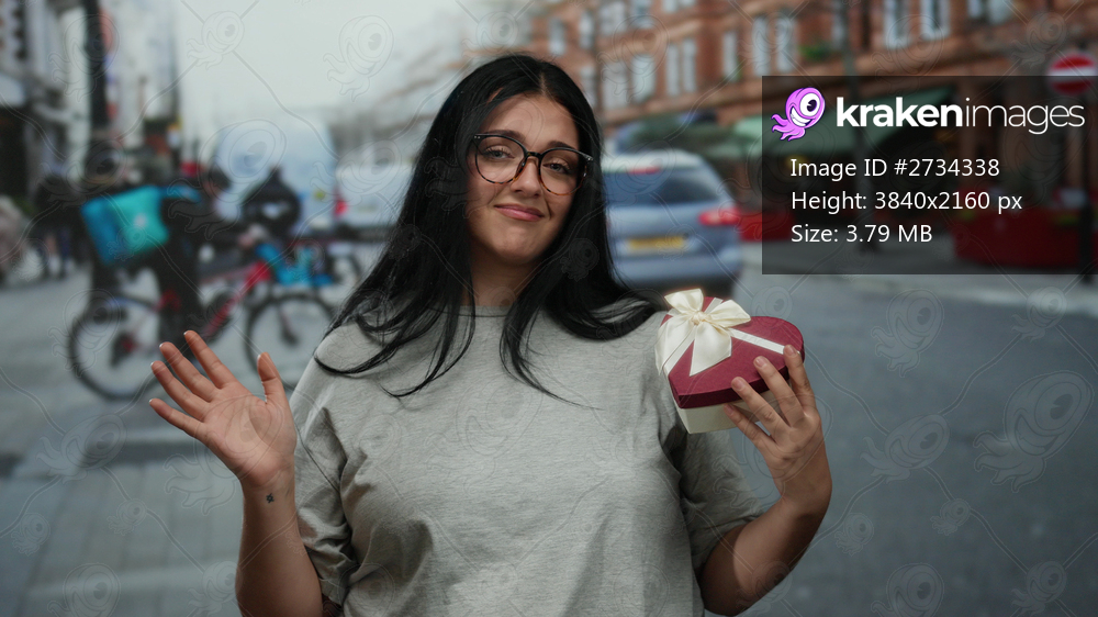Woman holding heart-shaped gift box on busy city street with delivery cyclists in the background showcasing urban lifestyle.
