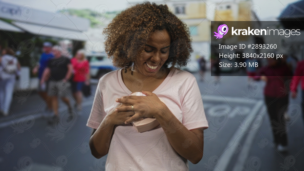 Woman holding heart shaped gift box to chest on busy city street smiling with closed eyes; joy gratitude.