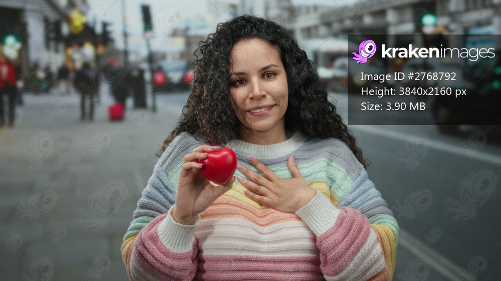 Woman holding heart-shaped object on urban street, wearing colorful sweater, capturing vibrant expression and city life vibe.