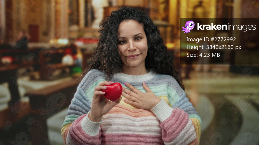 Woman holding heart symbol inside church symbolizes spirituality kindness and connection in a serene atmosphere captured in a hispanic cultural context indicating warmth and devotion. - Kraken Images