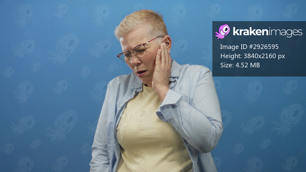 Woman holding her cheek with one hand, pressing jaw in a clear toothache while wearing glasses and a light shirt against a plain blue studio wall; pain. - Kraken Images