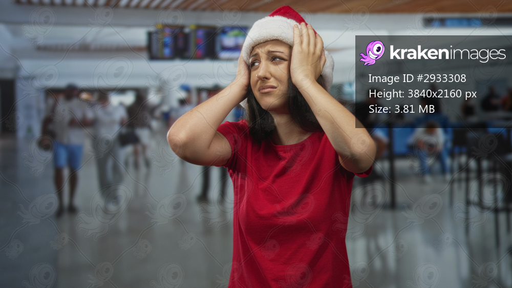 Woman holding her head with both hands at an airport terminal wearing a santa hat and red shirt; holiday travel stress.