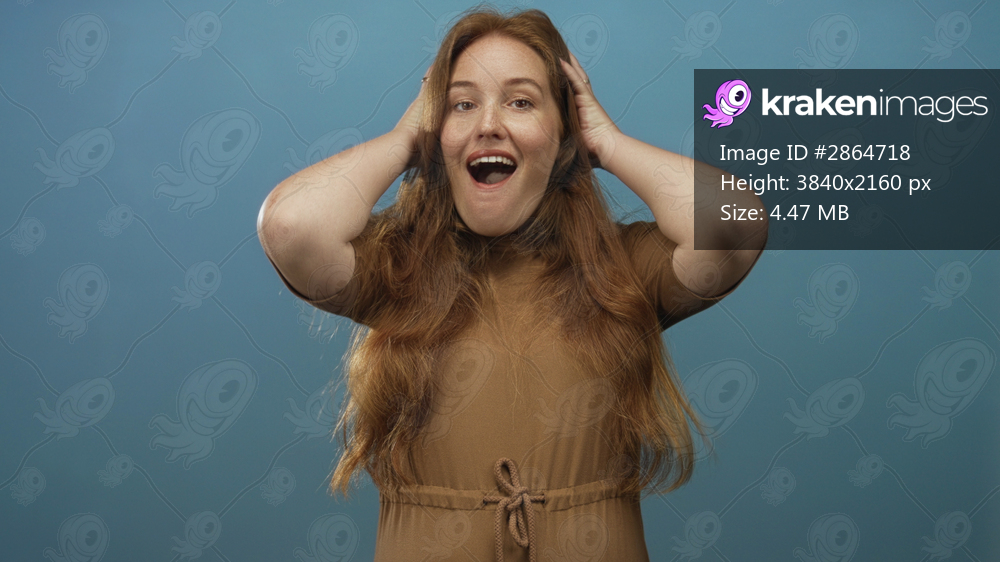Woman holding her head with both hands and open mouth expression under bright studio lights; surprise.