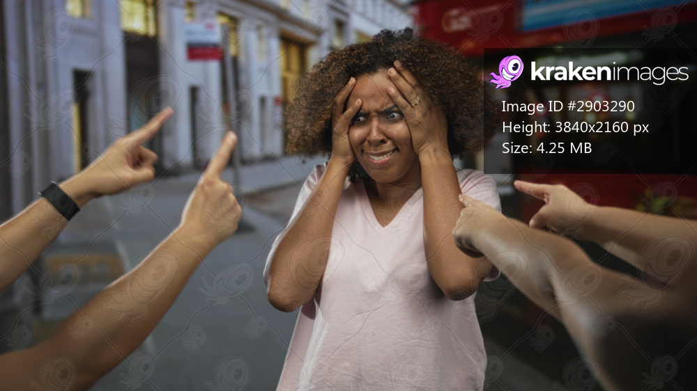 Woman holding her head with hands while surrounding hands point fingers at her on street near red bus; public shaming distress.