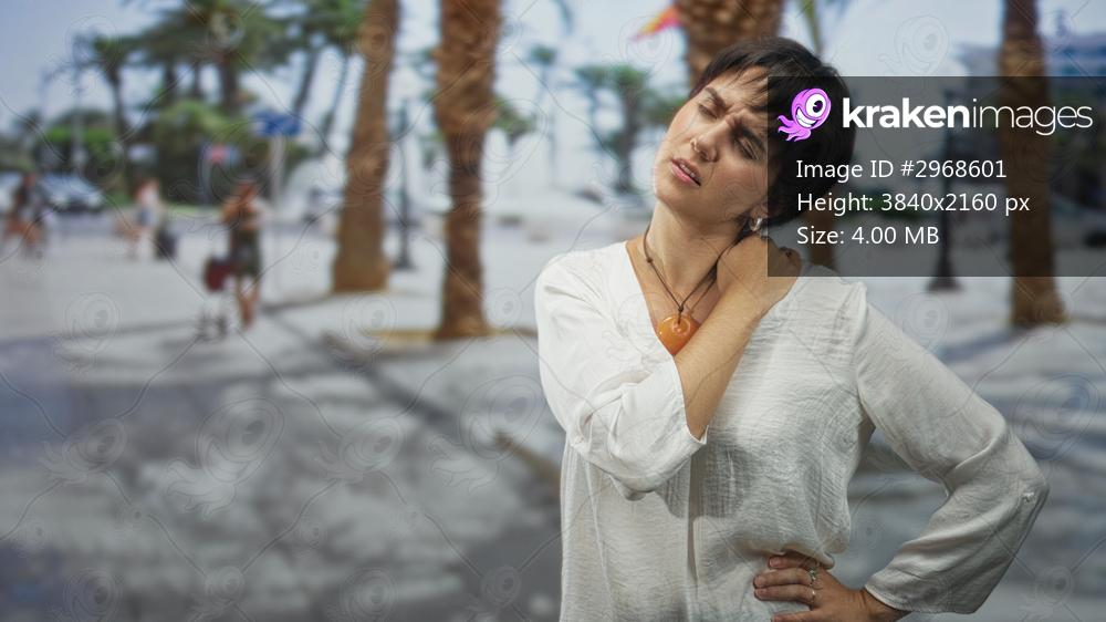 Woman holding her shoulder with one hand, eyes closed, wearing a white blouse and orange pendant on a palm lined street; pain recovery.