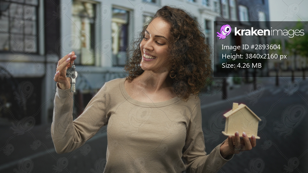 Woman holding house model and keys on street, smiling while presenting new home and looking at keys; homeownership pride.