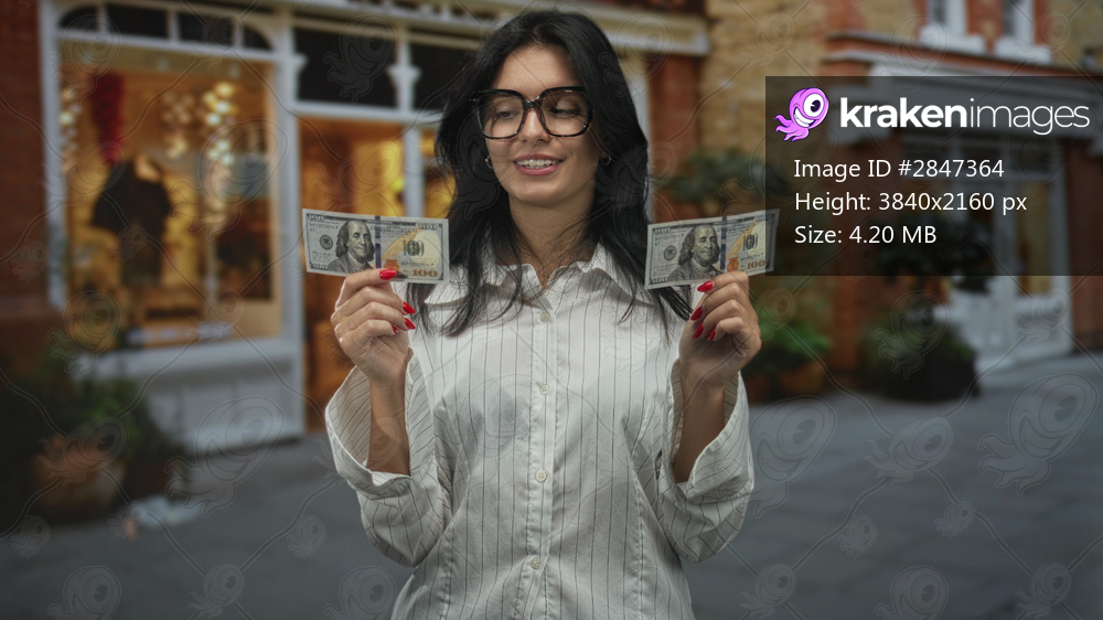 Woman holding hundred dollar bills with both hands, smiling behind glasses on street near storefront shop; joy.