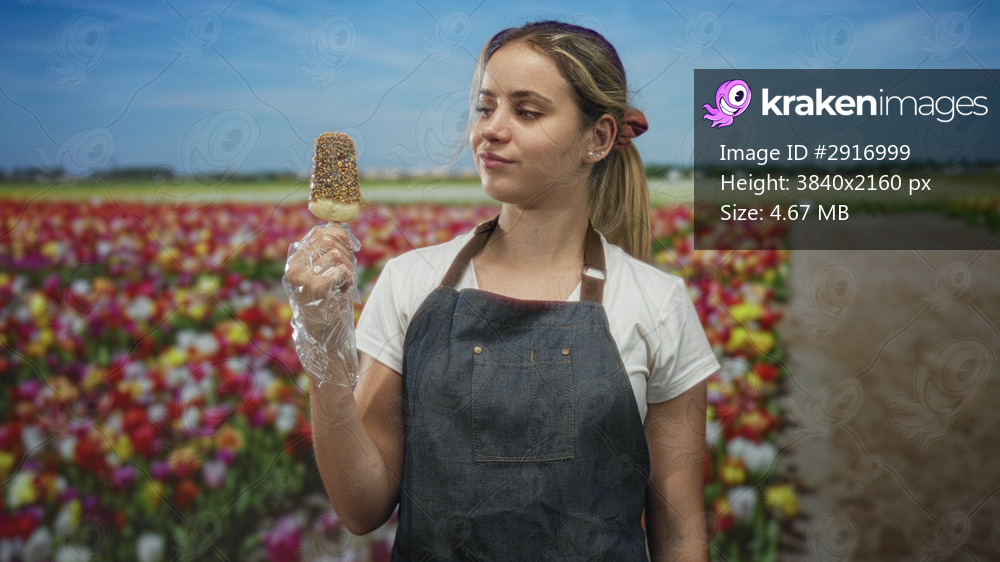 Woman holding ice cream bar with gloved hand in colorful tulip field rows, wearing apron; summer treat confidence.