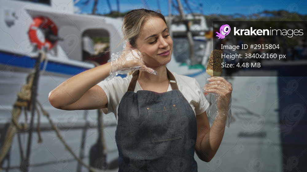 Woman holding ice cream bar and making phone hand gesture at port pier wearing denim apron and plastic gloves; playful summer moment.