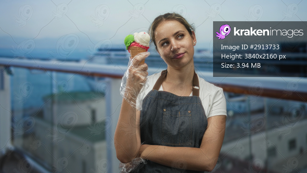 Woman holding ice cream cone with gloved hand on cruise deck with crossed arm, slight smile; summer leisure calm.