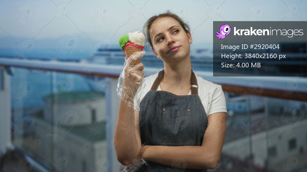 Woman holding ice cream cone with gloved hand on cruise deck with crossed arm, slight smile; summer leisure calm.