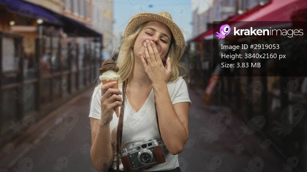 Woman holding ice cream cone and hand to mouth on a street with straw hat and vintage camera; joy travel memory.