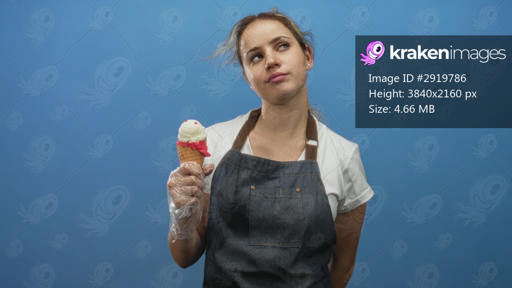 Woman holding ice cream cone in waffle cone with plastic glove and denim apron, looking to the side in blue studio; playful summer indulgence.
