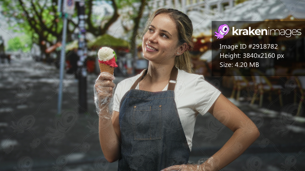 Woman holding ice cream cone on street terrace outdoors with denim apron and gloved hand; joy summer treat.