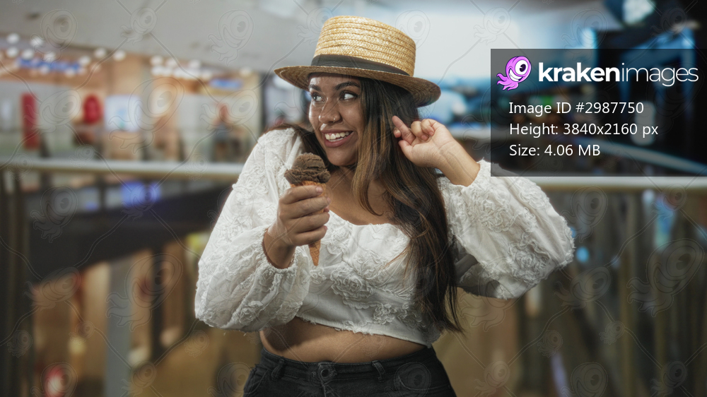 Woman holding ice cream cone and tugs ear in building mall railing, wearing straw hat and white blouse while smiling and posing playfully; joy summer fun. - Kraken Images