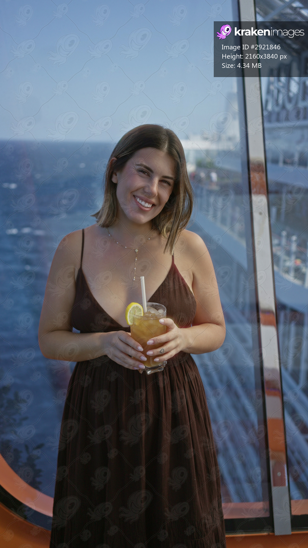 Woman holding iced cocktail with lemon slice and straw on cruise deck by glass window, smiling at ocean view; vacation contentment.