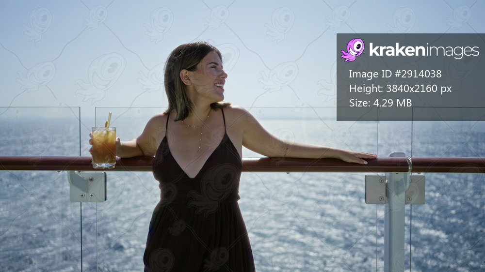 Woman holding iced cocktail with lemon, stirring straw and leaning on cruise deck rail while smiling toward the sky; serenity.