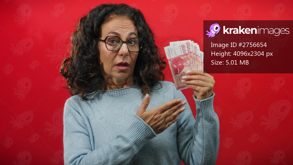 Woman holding icelandic banknotes on isolated red background, expressing curiosity with middle age features and an intrigued look at the money in hand. - Kraken Images