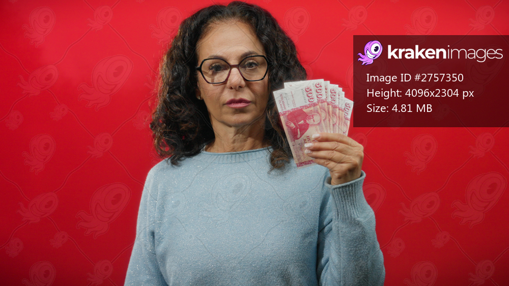 Woman holding icelandic banknotes on isolated red background, expressing curiosity with middle age features and an intrigued look at the money in hand. - Kraken Images