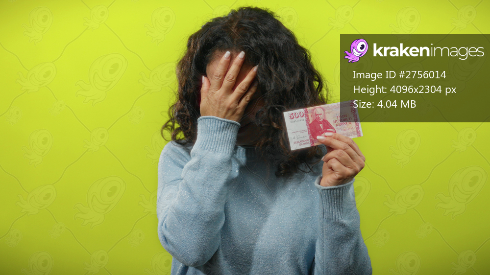Woman holding icelandic krona appears worried against a bright yellow background.
