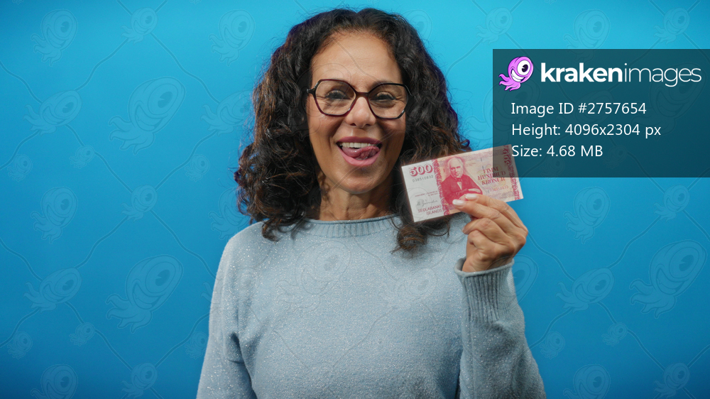 Woman holding icelandic krona banknote over isolated blue background, smiling and sticking out tongue, highlighting middle age financial confidence and humor. - Kraken Images