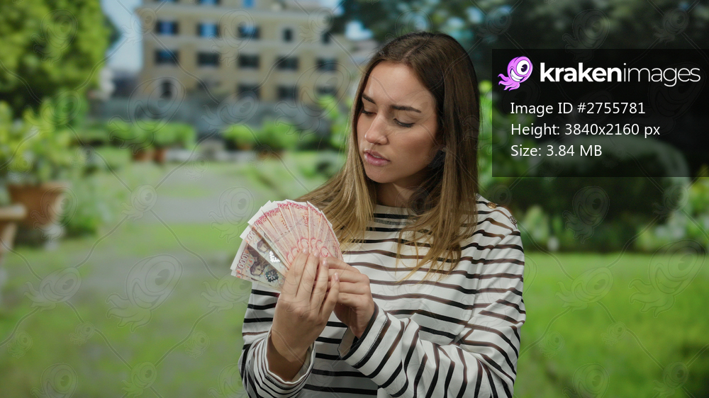 Woman holding icelandic krona banknotes in outdoor park setting with a thoughtful expression under bright natural light among lush green surroundings.