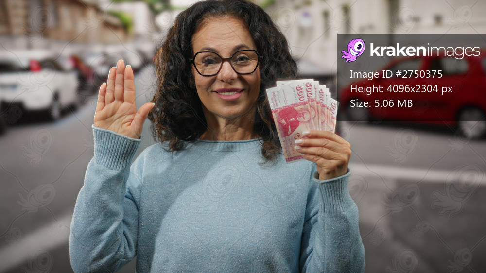 Woman holding icelandic krona banknotes on a city street raising her hand in a gesture of oath, symbolizing trust and financial commitment outdoors.