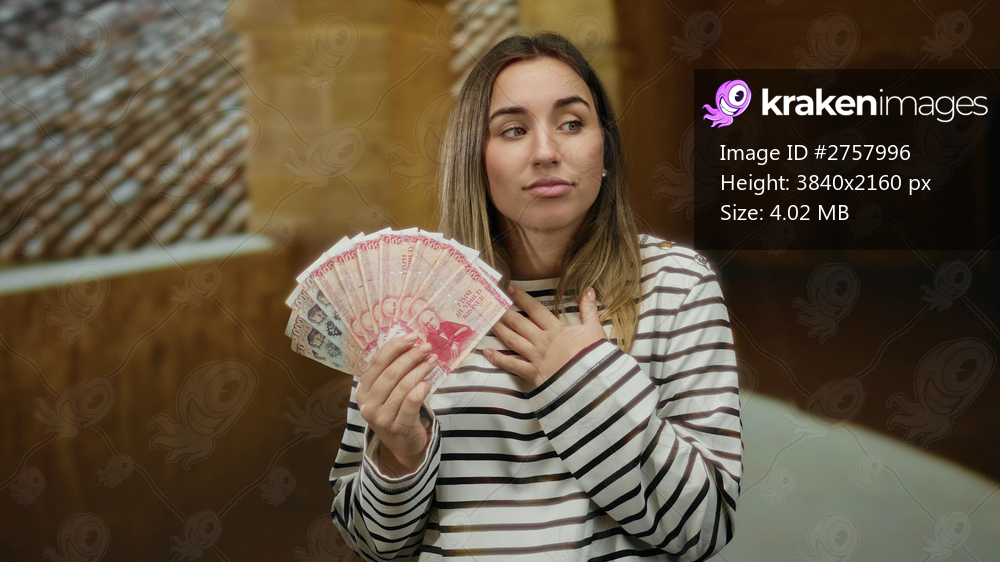 Woman holding icelandic krona banknotes outdoors at an old university setting wearing a striped shirt, showcasing currency in a thoughtful pose.