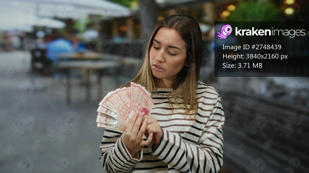 Woman holding icelandic krona banknotes outdoors on a busy street, showcasing finance and economy in an urban setting with casual attire and focused expression. - Kraken Images