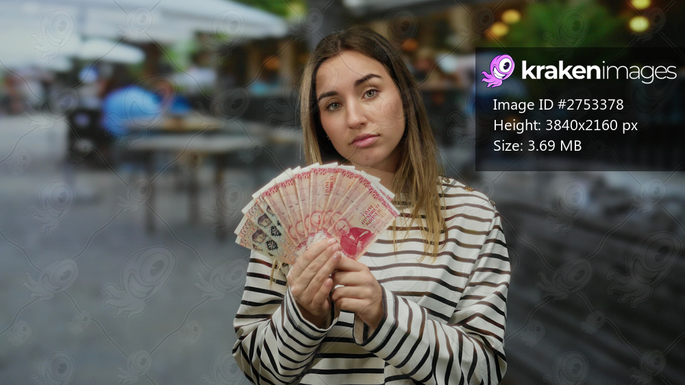 Woman holding icelandic krona banknotes outdoors on a busy street, showcasing finance and economy in an urban setting with casual attire and focused expression. - Kraken Images