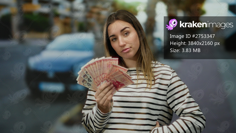 Woman holding icelandic krona outdoors with a thoughtful expression on a city street background.