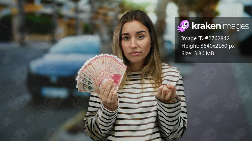 Woman holding icelandic krona outdoors with a thoughtful expression on a city street background.
