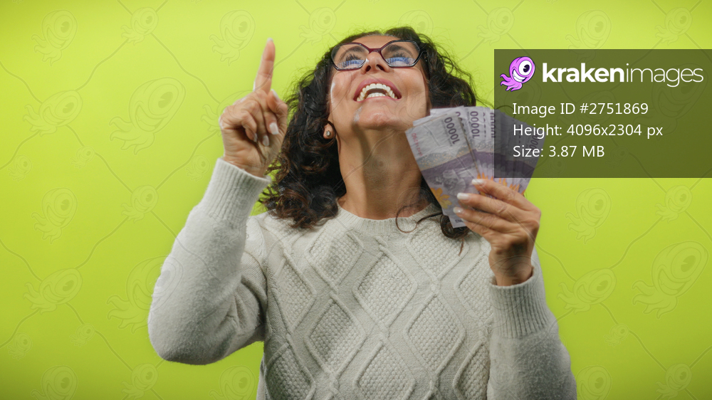 Woman holding indonesian rupiah banknotes smiling and pointing up against a bright yellow isolated background representing success and wealth.