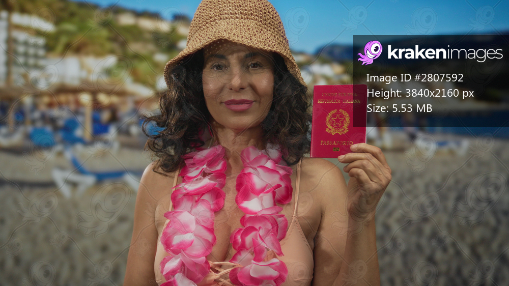 Woman holding italian passport smiling at beach wearing lei and bikini outdoors during vacation in sunny weather