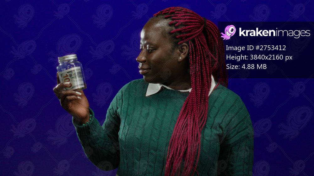 Woman holding jar containing dollar bill against vibrant blue background captures financial concept with focus on currency and expression.
