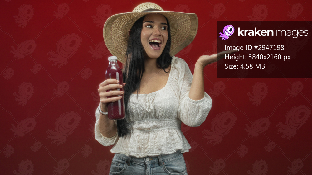 Woman holding juice bottle with palm up presenting gesture and straw hat, smiling in a studio; joy refreshment.