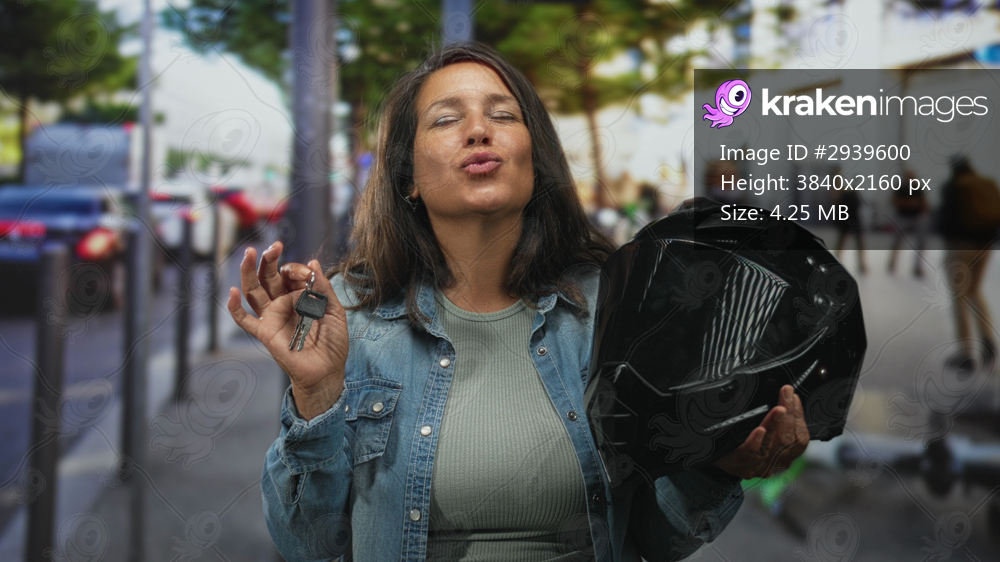 Woman holding keys in hand and carrying a motorcycle helmet on a busy street, smiling directly at camera; confidence independence.